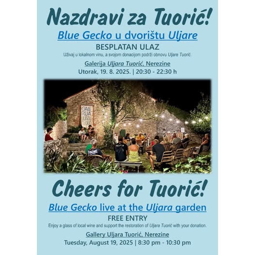 Das österreichische Gitarrenduo Blue Gecko war Teil eines internationalen Kulturprojekts auf der kroatischen Insel Lošinj. Im historischen Gebäude der ehemaligen Ölmühle „Uljara Tuorić“ in Nerezine wurde ein Konzertabend veranstaltet, dessen Ziel nicht allein musikalische Unterhaltung war, sondern die aktive Unterstützung der Restaurierung und kulturellen Wiederbelebung dieses denkmalgeschützten Ortes.